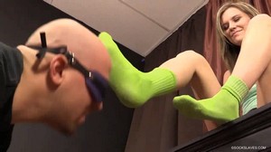 Mistress Kelly makes her slave worship on her sweaty green socks before removing them to taste on her bare feet and suck on her toes