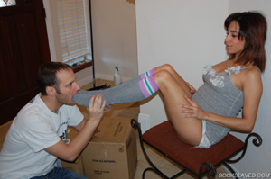 Mistress Charlie makes her slave girl worship and suck on her toes and her aerobic gym socks