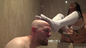 Mistress Austin decides to make her slave sniff and suck all the sweat of her long white socks before she is going to take her shower after a sweaty session of volleyball