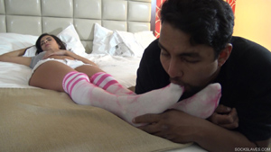 Mistress Shavelle is taking a nap on her bed when her slave sneaks up to her socked feet and can't resist the temptation to worship on her cute long pinkish socks she was too tired to remove before she falls asleep
