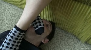 Mistress sin Sage is reading a magazine and paying little attention to her loser slave under her feet worshipping on her socks