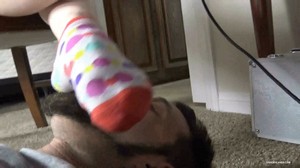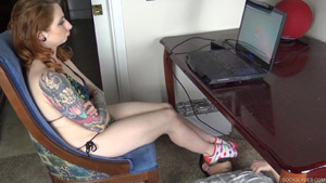 Mistress Olivia is working with her laptop while her socked feet is buried on the face of her slave busy sniffing and worshipping on them
