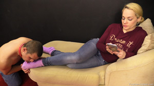 Mistress Jade lazes on the sofa and plays with her phone while her slave gets busy worshipping on her pink socks