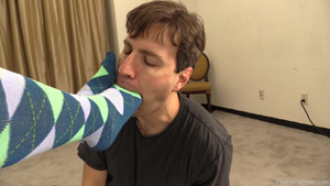 Mistress Jenna is having fun looking down at her slave who is busy worshipping on her socks